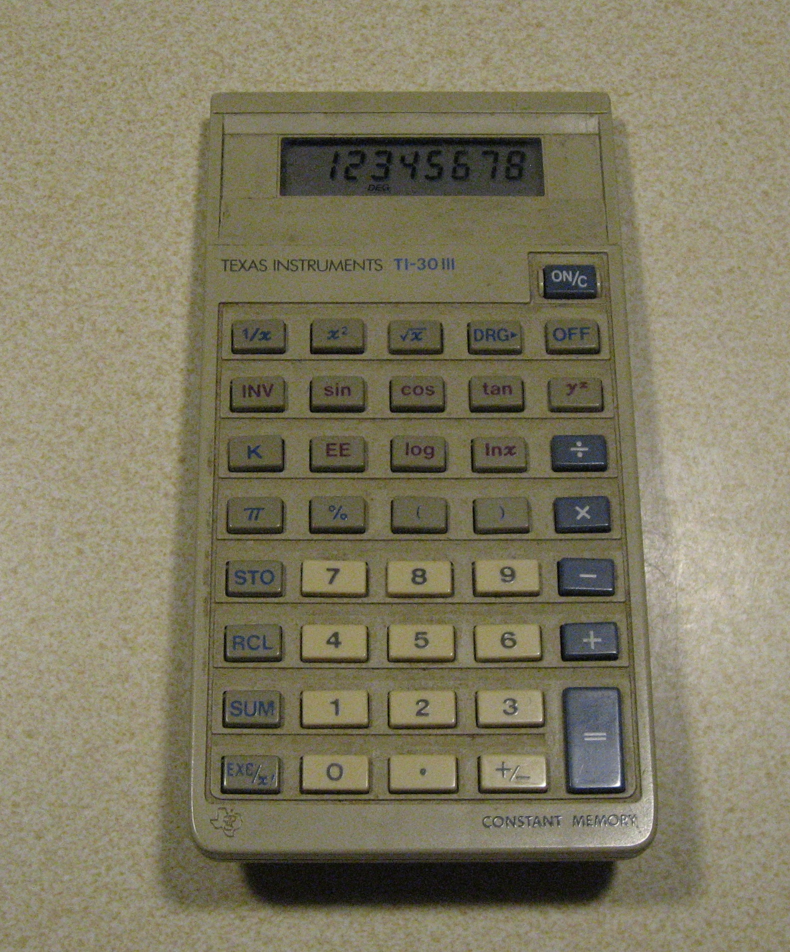 This TI-30 III was my first calculator. All students taking the sciences track in my high school had to buy this model as a sophomore. As I recall, the school puchased them in bulk and handed them out one day in class. We had to pay a modest amount, I think about $20. This was 1984. The original batteries (LR44 x 2) lasted until about 2008 when I replaced them because the screen was getting dim.